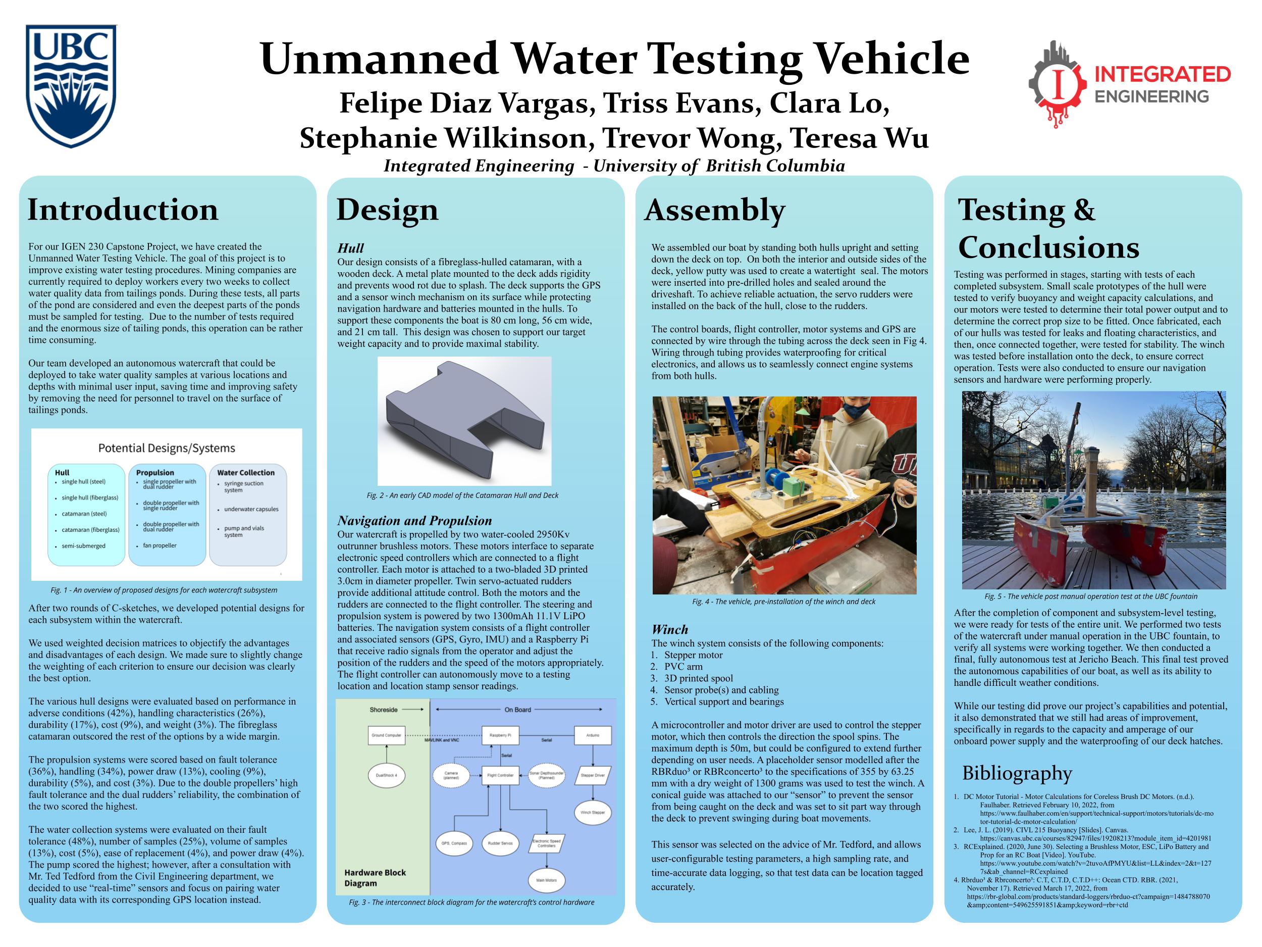 Designed, tested, and fabricated an autonomous RC boat for water quality testing; composite catamaran hull and full mechatronics integration.